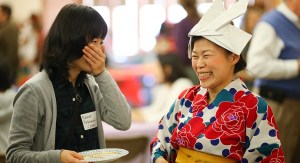 Kazue Takahashi covers her mouth as she laughs at her friend Shigemi Wakana, who is wearing an origami hat she made for the Small World 50th anniversary event at First Presbyterian Church, 2415 Clinton Parkway, on Thursday, April 19, 2018. Small World, which is an English language program for international women, hosted an open house where women from various countries brought cultural items including food, clothing and crafts to offer to visitors. Both of the women are from Japan.